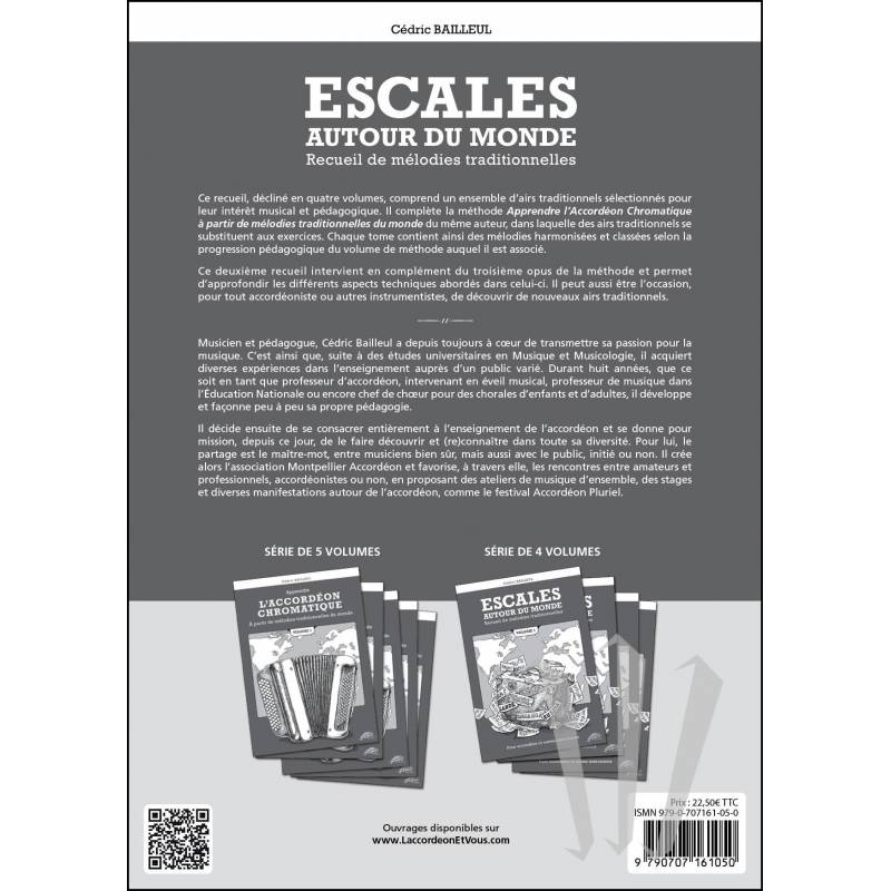 This collection, available in four volumes, includes a set of traditional tunes selected for their musical and educational interest. It completes the method "Learning the chromatic accordion from traditional melodies of the world" by the same author, in which traditional tunes replace the exercises. Each volume thus contains melodies harmonized and classified according to the pedagogical progression of the method volume with which it is associated. This second collection comes in addition to the third opus of the method and allows to deepen the various technical aspects approached in this one. It can also be an opportunity for any accordionist or other instrumentalists to discover new traditional tunes.