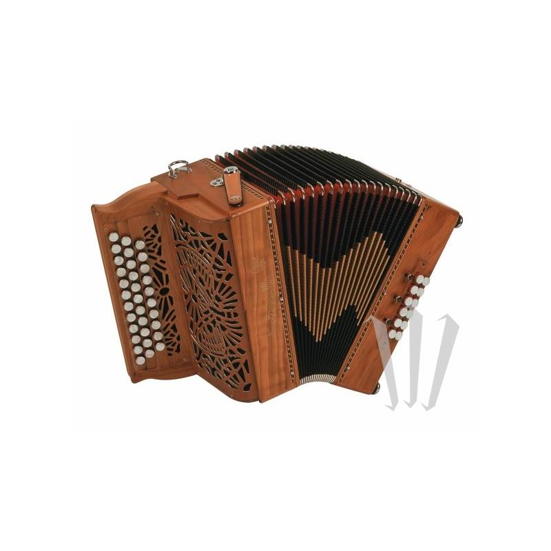 This model further demonstrates Saltarelle's know-how in crafting top-of-the-range 2 and a half row diatonic accordions, fitted with automatic couplers on both hands.