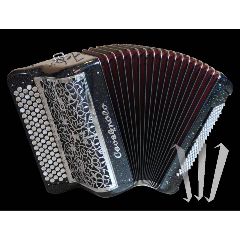 O acordeão é fornecido com um estojo de transporte e alças de ombro.