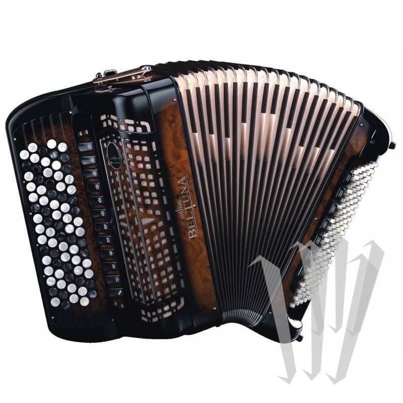 O Beltuna Leader IV K é um acordeon de botões cromáticos high-end com caixas de ressonância, 5 linhas, 77 botões, 4 vozes, 12 registros em versão piccolo (MD) e 120 baixos, 5 vozes e 7 registros (MG).