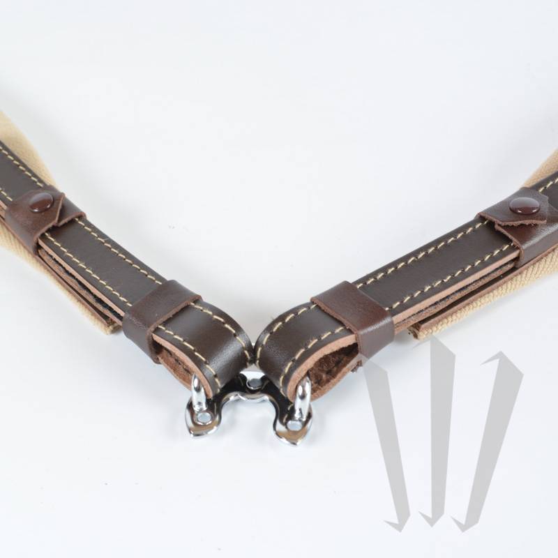 Este sistema único é composto por um velcro preso por presilhas de couro, uma das quais possui um botão de pressão para garantir uma fixação perfeita das alças.