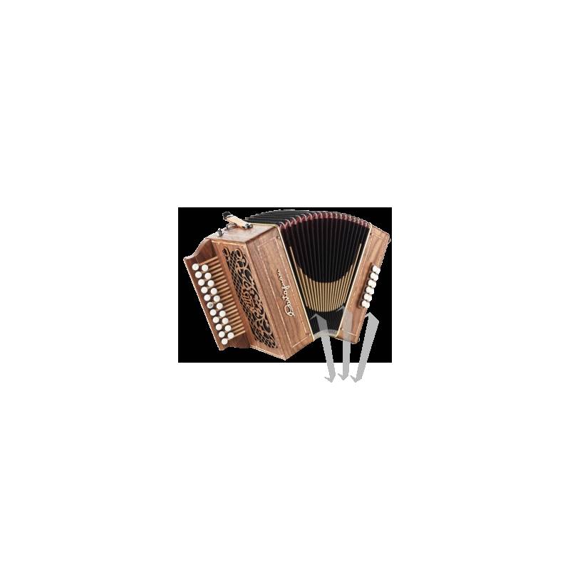 Диатоника Castagnari 2 ряда, 3 голоса для правой руки, 2 регистра, 12 басов, 3 голоса для левой руки.
