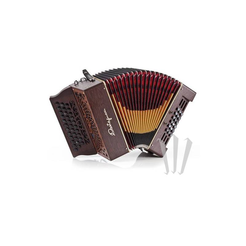 Diatonic Castagnari Mas 18: 3 ряда, 2 голоса для правой руки, клавиатура Milleret/Pignol, 18 басов (по диагонали), 2 голоса для левой руки.
