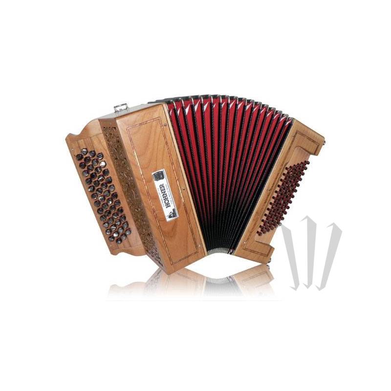 Хроматический аккордеон с 72 басовыми кнопками, компактный, легкий и универсальный, с 50 клавишами, 3 голосами, 3 регистрами, 4 рядами (5 опционально) для правой руки и 4 для левой руки. Предназначен для Trad и мировой музыки.