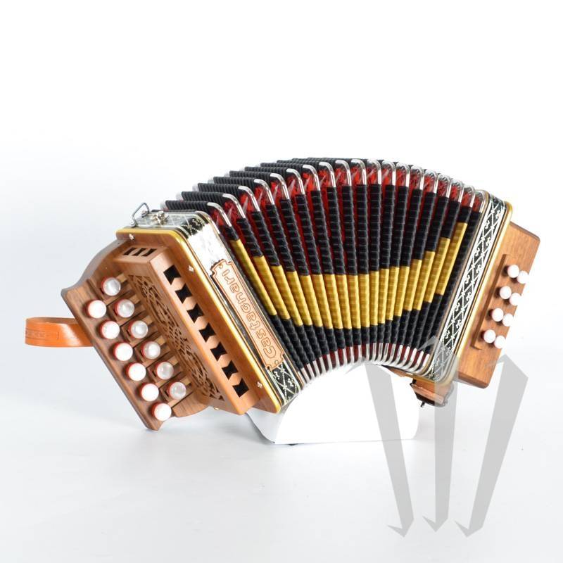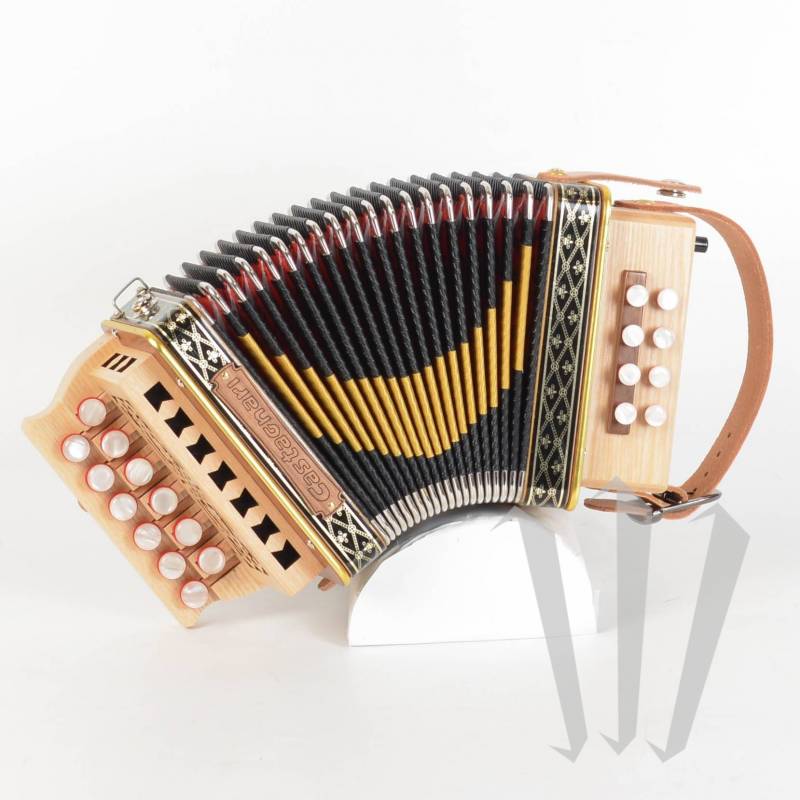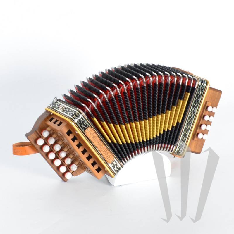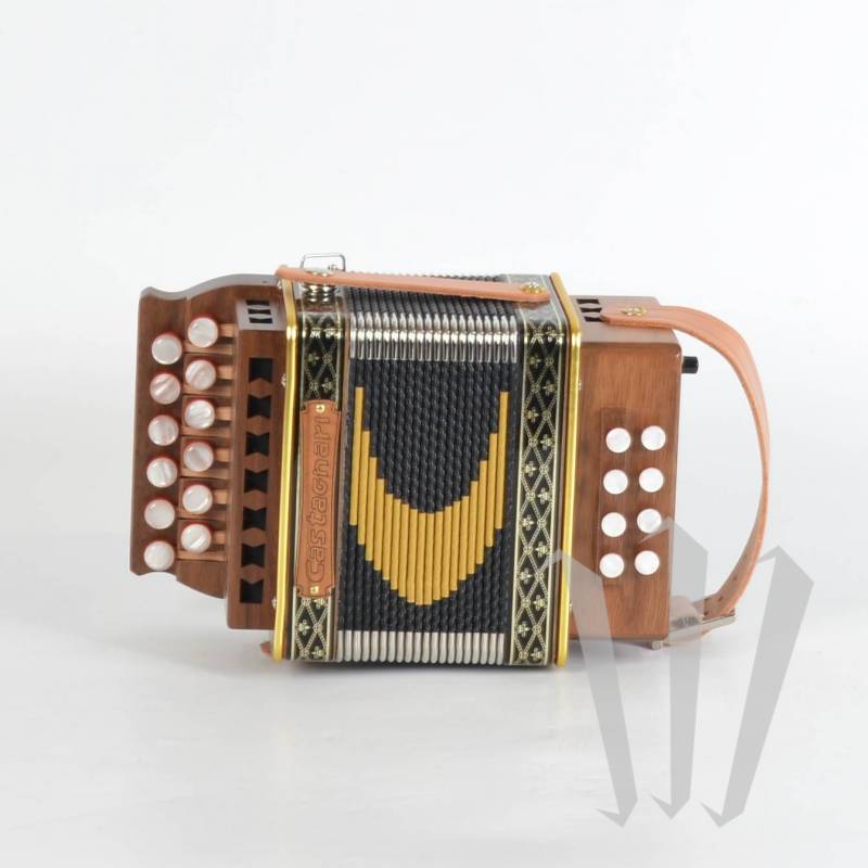 Очень маленький диатонический аккордеон с 2 рядами, 12 кнопками, 1 голосом в правой руке и 8 басами, 1 голосом в левой руке в G C (возможны другие тональности).