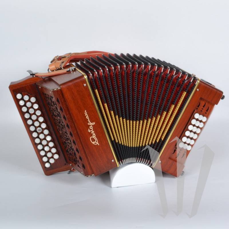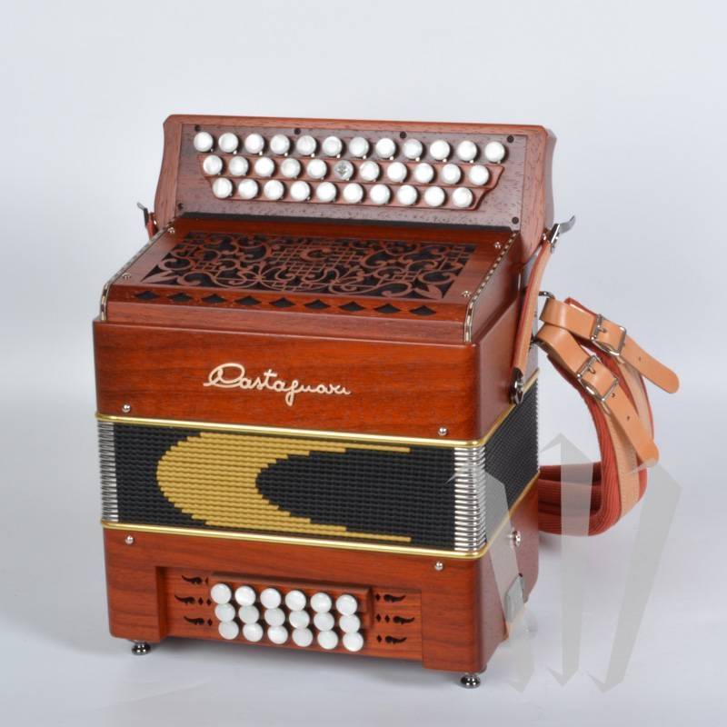 Castagnari Диатонический «малый формат» с 3 рядами, 2 правыми голосами и 18 басами, 2 левыми голосами.