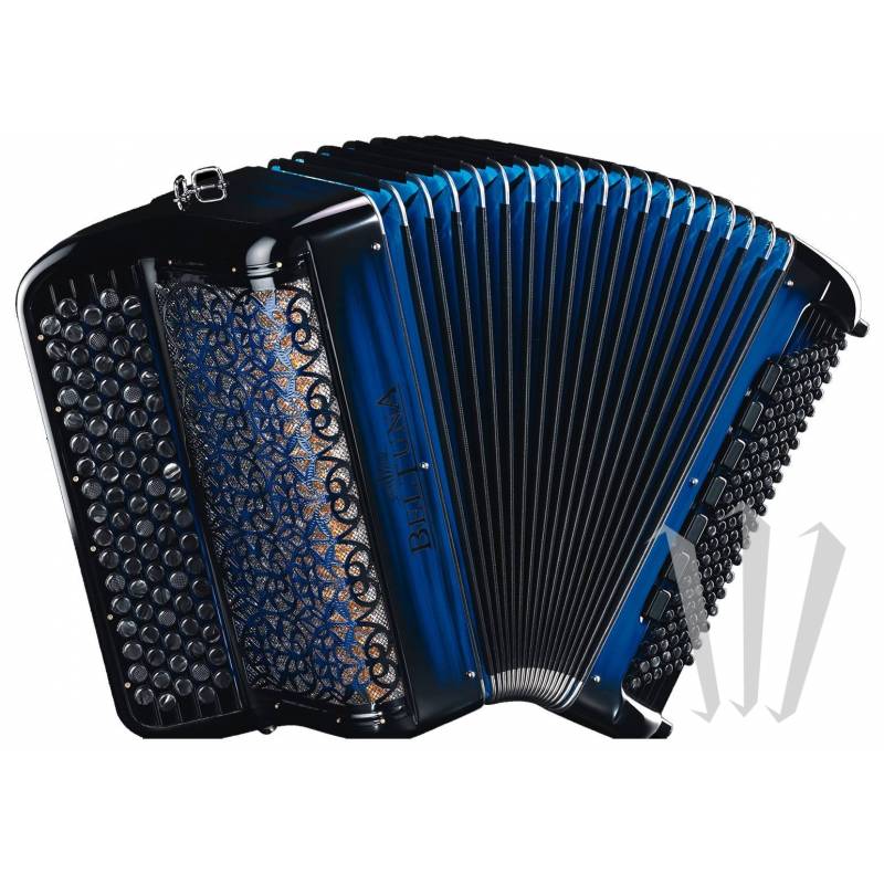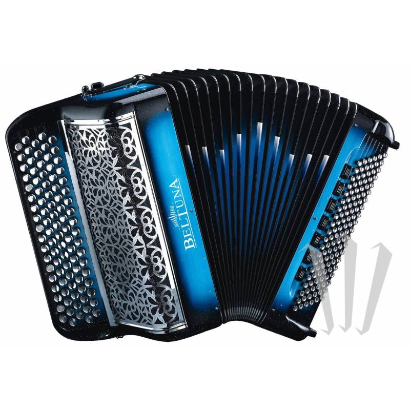 Beltuna Prestige 2000 - это хроматический баян высокого класса с резонансными ящиками, 4/5 рядами, 92 кнопками, 4 голосами, 5 регистрами (MD) и 120 басами, 5 голосами и 7 регистрами (MG).
