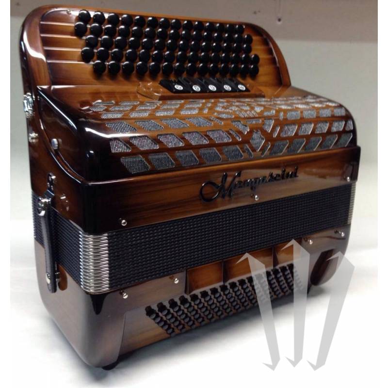 Mengascini C 44/3 — хроматический баян с 5 рядами, 72 кнопками, 44 нотами, 3 голосами, 7 регистрами (RH) и 96 басами, 4 голосами, 3 регистрами (MG).