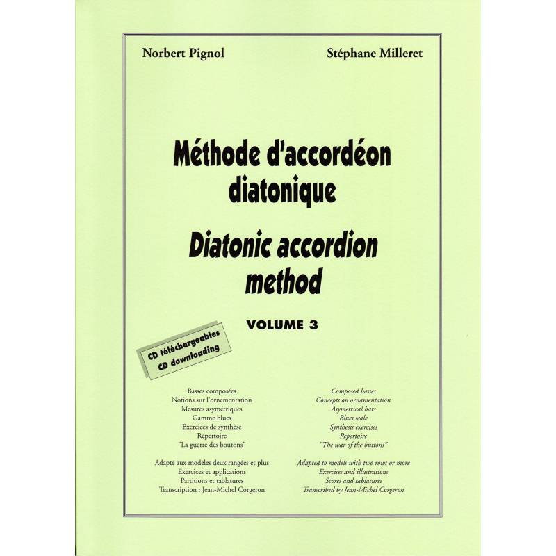 2002 年 7 月出版的第 3 卷发展了在前几本书中获得的概念,即:基本节奏、贝司的使用和交叉演奏的发现,这要归功于对与乐器音调相对应的音阶的初步研究(第 1 卷)。掌握低音持续时间,使用节拍器进行设置,使用完整或合成音阶,发现右手和弦并以有节奏或琶音的方式使用这些(第 2 卷)。在最后一部作品中,我们通过组合低音系统直接进入和声领域(它们完成右手和弦以产生丰富或不和谐)。还列出了所有倾向于个性化演奏的装饰,不对称的措施(它们包含不同长度的节拍,是东欧曲目的特征)。最后开发了布鲁斯音阶,乐器演奏者将通过该音阶发现即兴创作的方式。