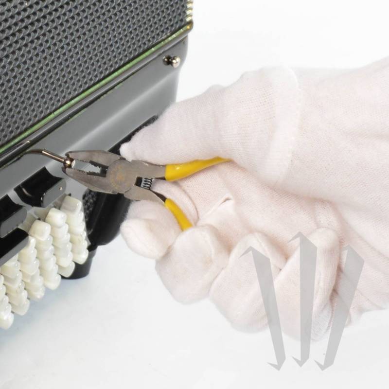 这些钳子是手风琴制造商和维修人员用来移除将手风琴的波纹管连接到其右手或左手身体的针的工具。它的尖端可以很好地抓住针头,以便在不损坏针头的情况下拉动针头。