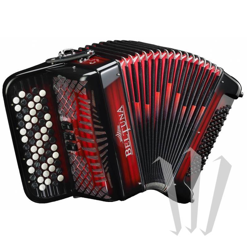 Beltuna Studio II K 是一款半音阶按钮手风琴,有 5 行、62 个按钮、2 个声部、3 个寄存器 (MD) 和 60 个贝司、4 个声部 (MG)。